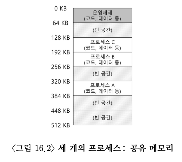 - 그림 16.2의 프로세스 A, B, C를 보자. 각 프로세스가 어떤 식으로 다른 주소에 탑재되었는지 알 수 있다.