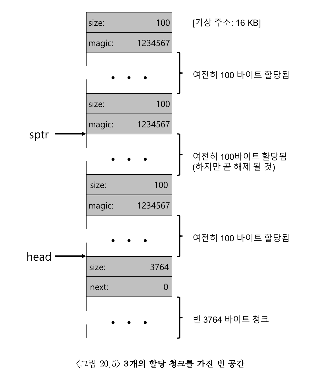 - 영역의 시작 주소를 16 KB라고 가정하자 이때 힙의 모양은 그림 20.3에서 보는 것과 비슷할 것이다.