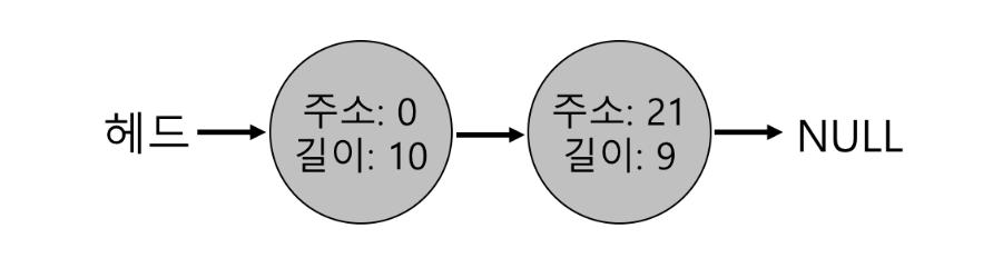 - 이전 상황에서 만약 free(10)을 호출하여 힙의 중간에 존재하는 공간을 반환할 때, 이 빈공간을 다시 리스트에 추가하면 위와 같은 모양이 됨.