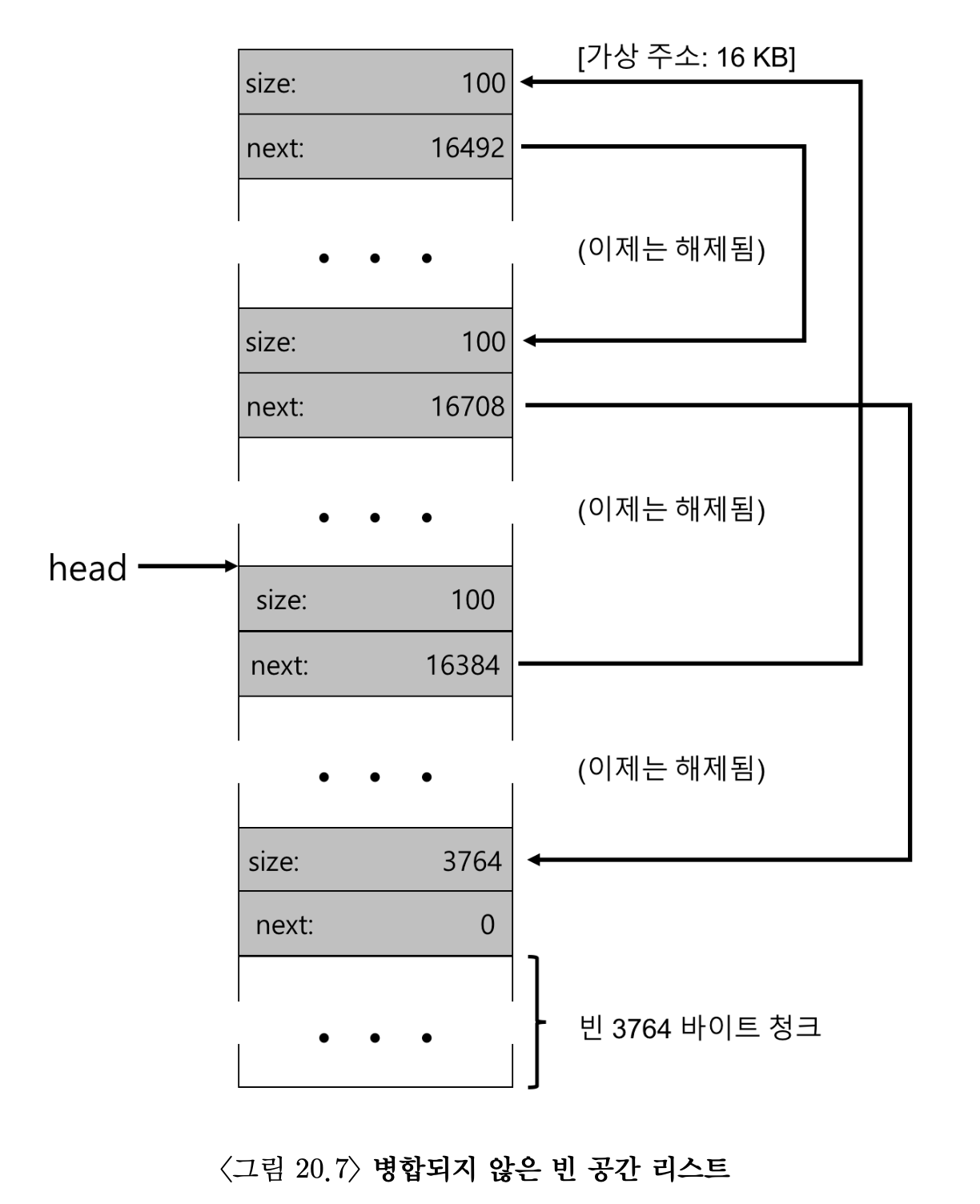 - 라이브러리는 신속히 빈 공간의 크기를 파악하고, 빈 청크를 빈 공간 리스트에 삽입한다. 빈 공간 리스트의 헤드 쪽에 삽입한다고 가정하면 공간의 모양은 그림 20.6과 같다.