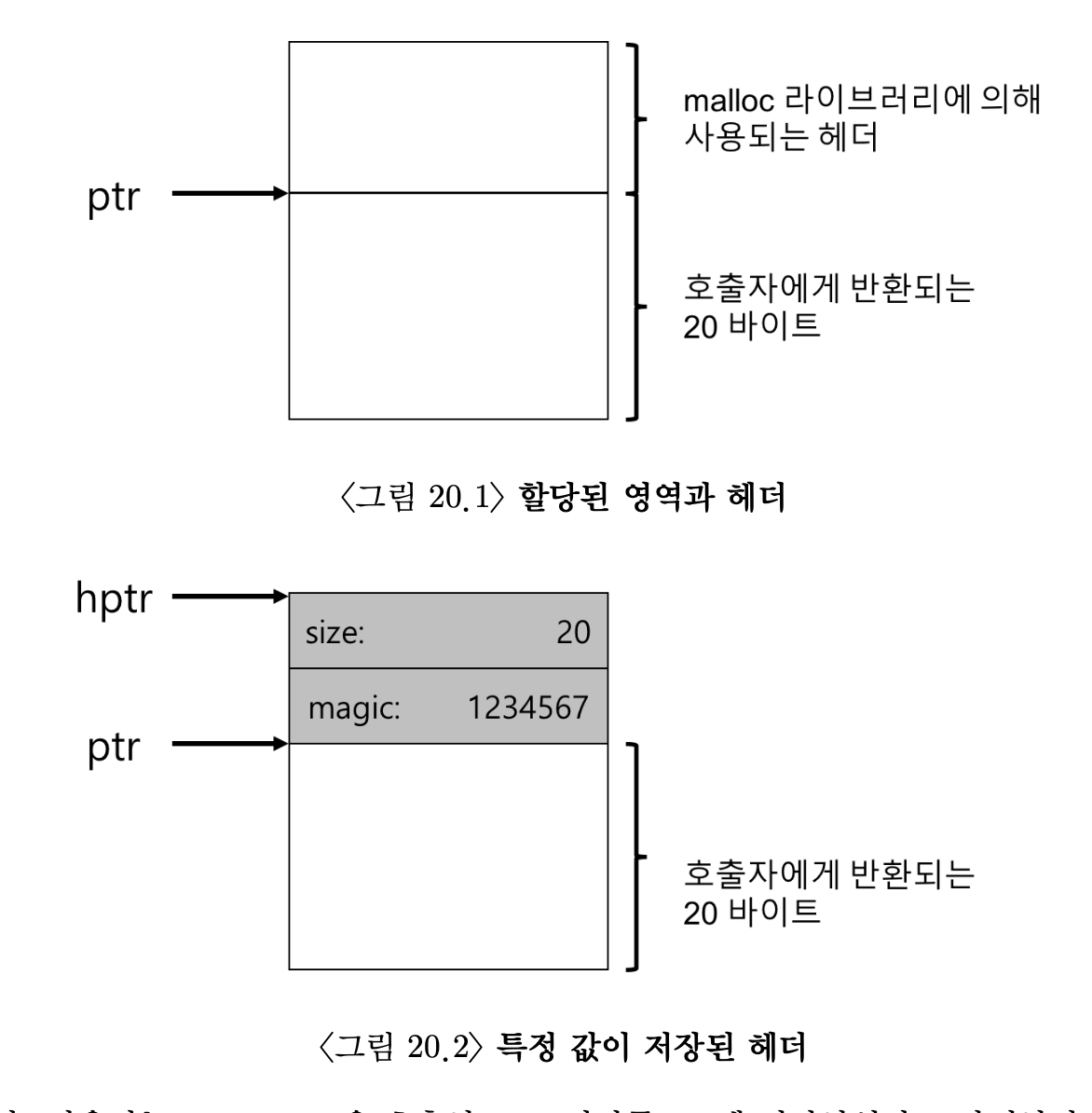 - 헤더는 적어도 할당된 공간의 크기는 저장해야 한다(이 경우 20). 또한, 해제 속도를 향상시키기 위한 추가의 포인터, 부가적인 무결성 검사를 제공하기 위한 매직 넘버, 및 기타 정보를 저장할 수 있다.
