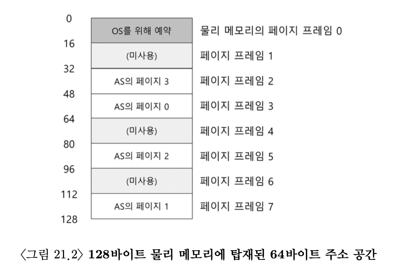 - 우리의 작은 64 바이트 주소 공간(4페이지짜리) 을 8페이지크기의 물리 메모리에 배치하기를 원한다고 할 때, 운영체제는 비어있는 네 개의 페이지만 찾으면 된다.