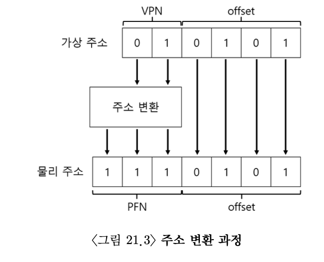 - 프로세스가 생성한 가상 주소의 변환을 위해 먼저 가상 주소를 가상 페이지 번호(virtual page number, VPN)와 페이지 내의 오프셋 2개의 구성 요소로 분할한다.